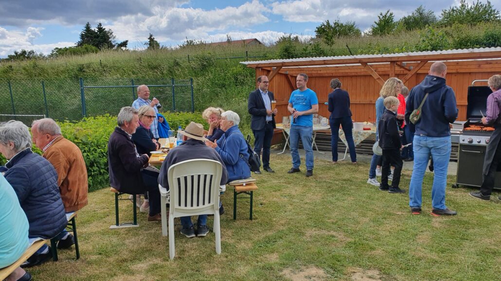 Nicht nur sportlich, sondern auch gesellschaftlich ist die Saison mittlerweile offiziell eröffnet. Zum Opening am 29. Mai kamen trotz recht kühler Temperaturen rund 40 Mitglieder und Gäste, darunter auch Bürgermeister Dr. Frank Blasch. Dass auf der kleinen Wiese zwischen Platz 1 und 2 gefeiert werden musste, weil auf der bisherigen Stammfläche gerade die Parkplatz-Bauarbeiten begonnen hatten, tat der guten Stimmung keinen Abbruch. Neben Gegrilltem und Salaten hatte der Vergnügungsausschuss mit einer Kuchentafel auf die Anlage gelockt, während sich die rund zehn Jugendlichen vor allem beim Schnuppertraining auf dem Platz austoben durften.